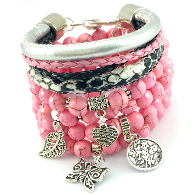 Cukierkowe, różowe bransoletki kamienie szlifowany howlit z charmsami sercem motylem liściem i kwiatkami oraz rzemieniami