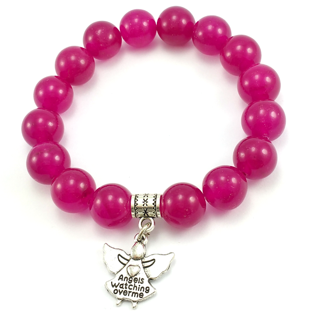 Nowe bransoletki kamienie szklisty jadeit w kolorze fuksji- różu z aniołem, sercem i koralikiem modułowym