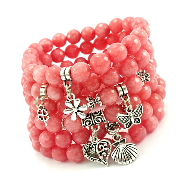 Nowe różowe bransoletki szlifowany jadeit z zawieszkami motylem, kwiatem, sercem, koniczyną i muszlą